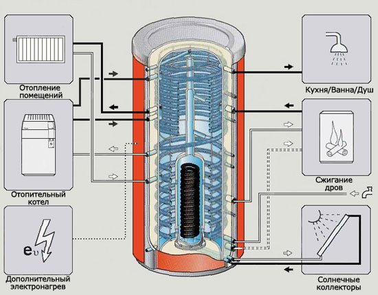 Der Tank hat vier Abzweigrohre - die oberen für die Zufuhr des heißen Kühlmittels und die unteren für den Rücklaufanschluss. An den Rücklaufleitungen sind Umwälzpumpen installiert. Kaltes Kühlmittel aus dem Kühlerkreislauf tritt in den Behälter ein. Außerdem tritt durch die Umwälzpumpe Wasser in das Gehäuse des Festbrennstoffkessels ein, erwärmt sich und gelangt nur durch das obere Rohr in den Akkumulator zurück. Dann wieder nur durch das obere Rohr Kühlmittel des Heizkreises gelangt in die Heizkörper, wo es gekühlt wird. Im Vorratsbehälter findet während der Zeit, in der das Hauptvolumen mit dem gekühlten Kühlmittel gefüllt ist, kein aktives Mischen von heißem und gekühltem Wasser statt, aber heißes Wasser fließt in die Batterien. Wenn der Kraftstoff jedoch intensiver zu brennen beginnt, gelangt mehr heißes Wasser in den Tank und somit wird er mit einem erhitzten Kühlmittel gefüllt. Da der Tank selbst über eine große Wärmedämmung verfügt, kühlt das erwärmte Wasser langsam ab, wodurch eine stabile Temperatur im Kreislauf über lange Zeit aufrechterhalten werden kann.