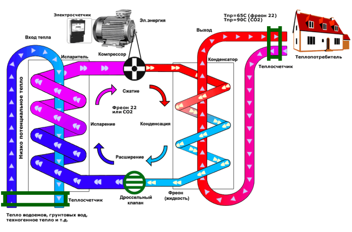Der ganze Raum um uns herum ist Energie – man muss nur wissen, wie man sie nutzt. Bei einer Wärmepumpe muss die Umgebungstemperatur über 1 °C liegen. Hier sollte gesagt werden, dass sogar die Erde im Winter unter Schnee oder in einiger Tiefe Wärme speichert. Die Arbeit einer geothermischen oder einer anderen Wärmepumpe basiert auf dem Transport von Wärme von ihrer Quelle mit einem Wärmeträger zum Heizkreislauf des Hauses.