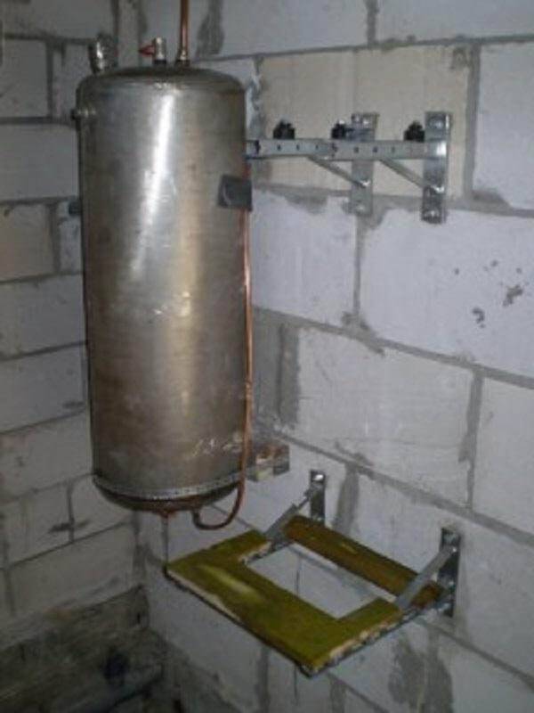 Im Großen und Ganzen kann der Kompressor separat erworben werden. Es muss ein Wärmetauscher zum Erhitzen von Wasser (Kondensator) hergestellt werden. Ein Kupferrohr mit einer Wandstärke von 1–1,2 mm und einer Länge von 35 m wird zu einer Spule auf ein Rohr mit einem Durchmesser von 350–400 mm oder einen Zylinder gewickelt. Danach werden die Windungen mit einer perforierten Ecke befestigt und dann wird die gesamte Struktur in einen Stahlbehälter mit Wasserleitungen gelegt.