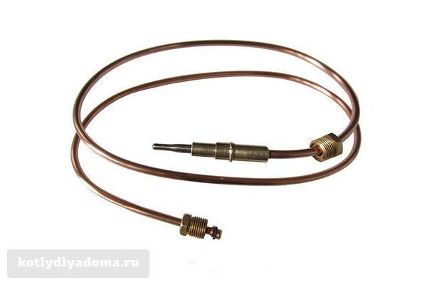 Ein Thermoelement ist ein Sicherheitselement eines Gasboilers, das beim Erhitzen Spannung erzeugt und das Brennstoffzufuhrventil offen hält, während der Zünder eingeschaltet ist. Der im Foto gezeigte Sensor arbeitet autark, ohne Anschluss einer externen Stromversorgung. Der Anwendungsbereich von Thermoelementen sind gasbetriebene energieunabhängige Installationen: Herde, Küchenherde und Warmwasserbereiter.