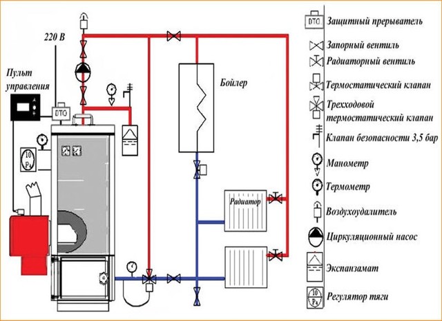 Schließen Sie den Wärmeerzeuger gemäß dem ausgewählten Schema an den Schornstein und die Heizungsanlage an. In der Endphase der Arbeiten wird die Automatisierung angepasst, der Lüfter repariert und eine Umwälzpumpe installiert.