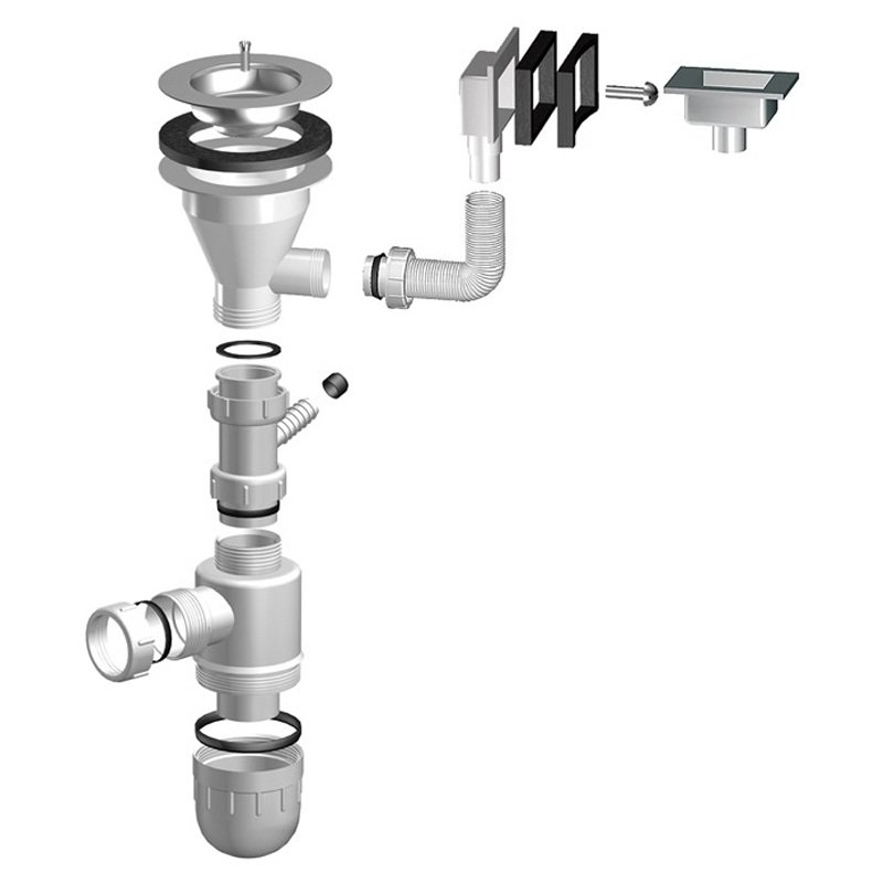 An der Oberseite und an der Seite eines solchen Siphons befinden sich zwei Löcher mit unterschiedlichen Durchmessern. Einer dient zum Anschluss des Seitenablaufs und der andere zum Anschluss des Systems an den Abwasserabfluss.Entsprechend den Abmessungen dieser Löcher werden eine Kegeldichtung (breit) und eine Überwurfmutter ausgewählt;