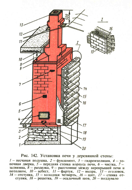 Trotz der hohen Wärmekapazität des Ofenziegels muss der Kamin von der Wand isoliert werden. Dazu muss die Dicke des Mauerwerks, das der Wand am nächsten ist, mindestens 25 cm betragen.Außerdem wird das Außenmauerwerk mit Hilfe von Vermiculit, Basaltwolle und Perlit von den Wänden eines Holzhauses isoliert.