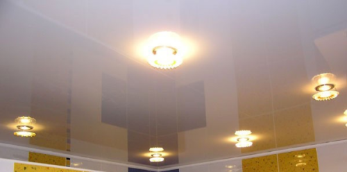 Die beste Lösung ist die Installation von Einbauleuchten, die nicht über die Deckenfläche hinausragen. Geräte können am Umfang oder in einem Schachbrettmuster angeordnet sein.