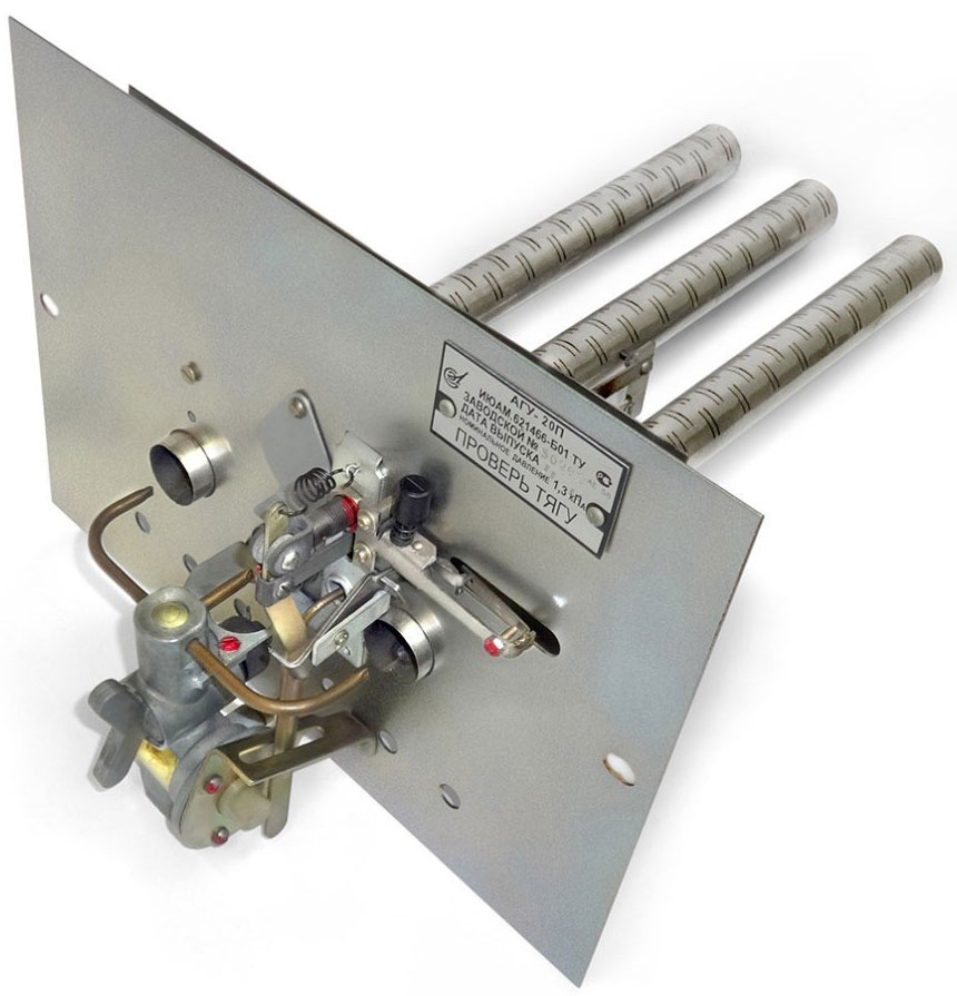 Arbeiten aufgrund des Sauerstoffzuflusses auf natürliche Weise führen zu einer vollwertigen Verbrennung von Brennstoff, die Entfernung von Verbrennungsprodukten erfolgt durch einen herkömmlichen Schornstein. Der Betrieb des Geräts wurde durch die Verwendung von atmosphärischen Geräten und speziellen Düsen für Gasbrenner vereinfacht.