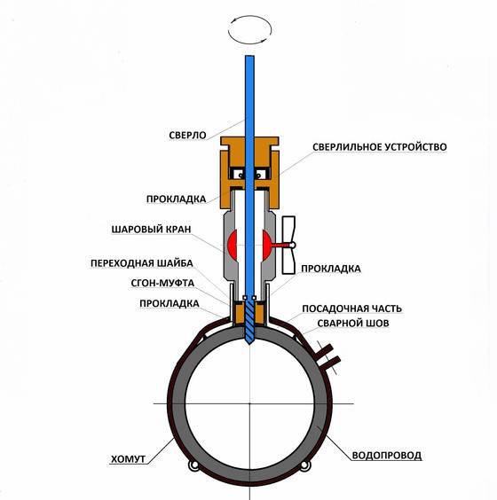 Der Rest des Prozesses ähnelt dem Einbinden durch Schweißen: Ein Bohrer wird durch einen Gewindebohrer in die Armatur eingeführt und ein Loch gebohrt. Wenn der Auslass einen kleinen Durchmesser hat und der Druck in der Wasserversorgung innerhalb von 3–4 kgf / cm² liegt, kann der Wasserhahn auch nach dem Bohren problemlos angeschraubt werden (wenn er mit Gewinde versehen und nicht geschweißt ist). Der Anschluss zusätzlicher Leitungen an die Gussleitung erfolgt ebenfalls über Klemmen.