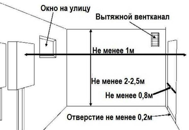 - der Heizraum ist an einer leeren Wand in einem Abstand von mindestens 1 Meter zu den nächsten Fenstern und Türen befestigt;