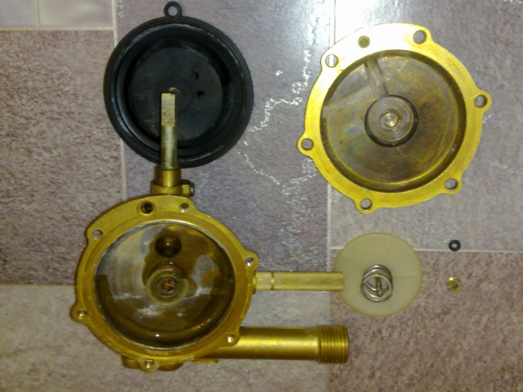 Nachdem Sie den Frosch befreit und das letzte Wasser abgelassen haben, schrauben Sie den Deckel ab. Oft sind die Schrauben sauer. Um die Arbeit zu erleichtern und um die Schlitze nicht zu stören, verwenden wir das Spezialwerkzeug WD-40. Entfernen Sie nach dem Lösen der Schrauben den Deckel, entfernen Sie die Membran und überprüfen Sie den Zustand im Inneren.
